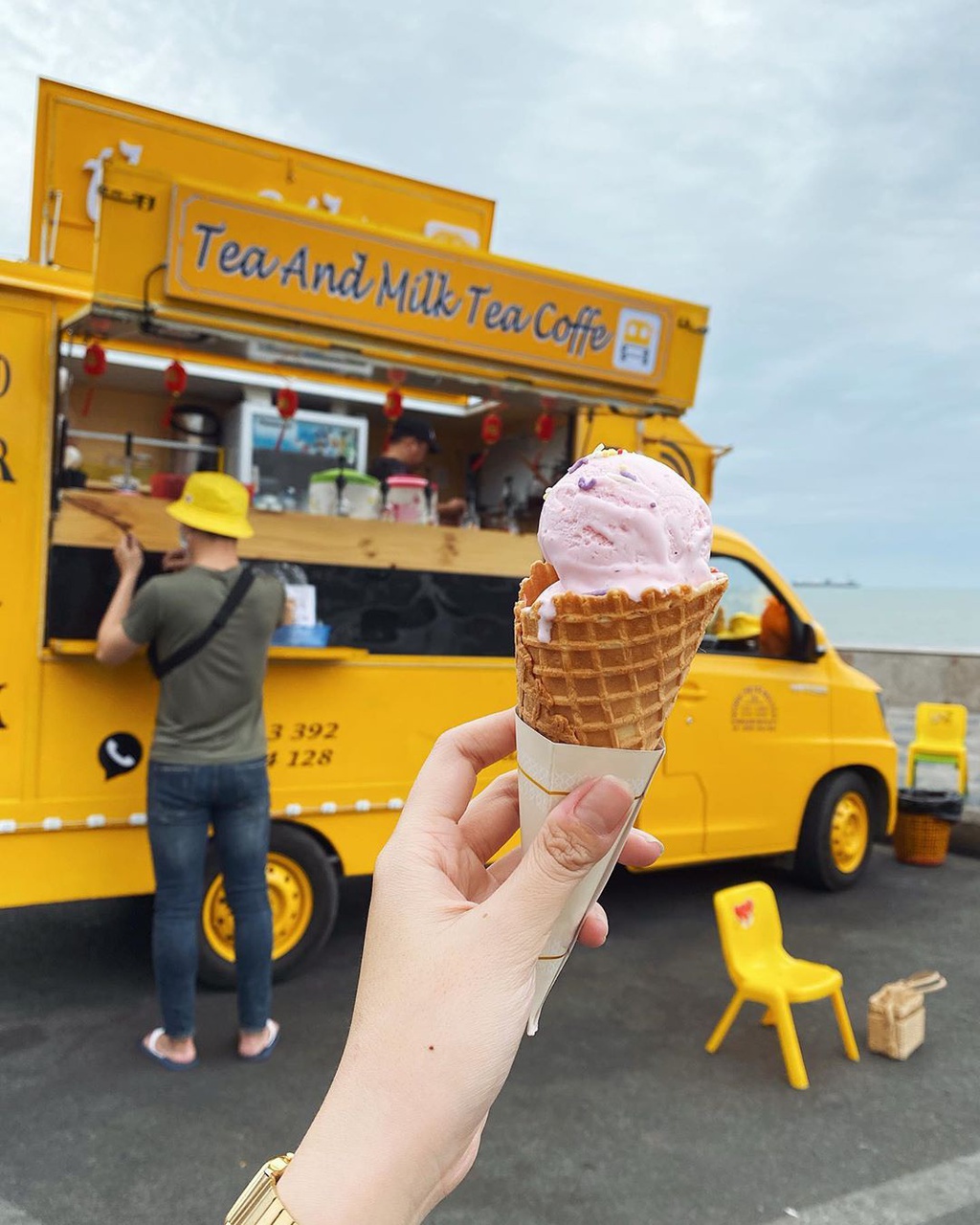 Không bàn ghế sang trọng hay không gian decor xinh xắn, xe kem vẫn hút du khách khi đến với thành phố biển. Vì là mô hình lưu động nên chỗ ngồi tại quán khá hạn chế. Nơi này chỉ có vài chiếc ghế nhựa cho thực khách muốn nán lại. Ngoài các loại kem, thực đơn các quán cũng khá đa dạng từ cà phê, trà đến nước ép… giá khoảng 25.000-40.000 đồng. Ảnh: Iamfoodtester, lhoangyen_.